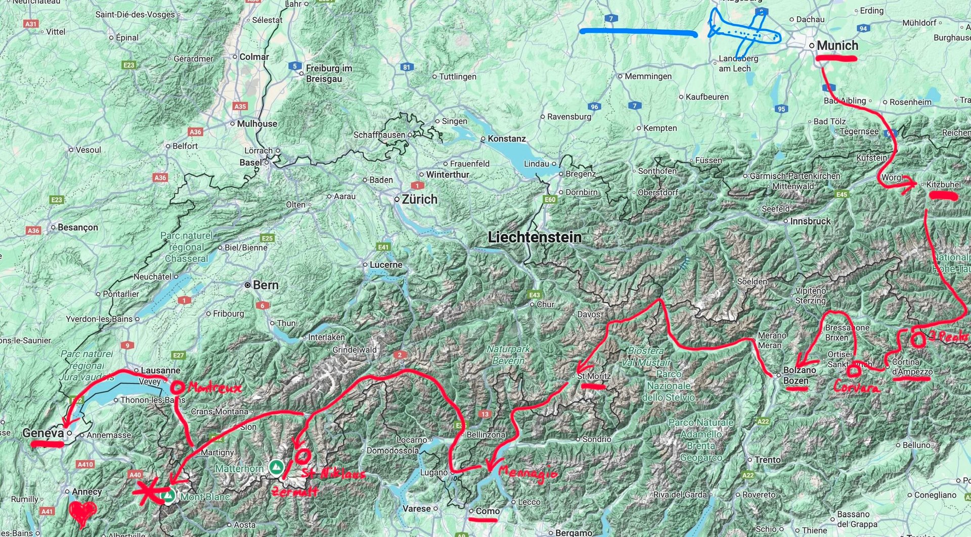 This two month tour through the Alps was conceived after my daughter, Evelyn, and her husband, Ned, secured a ski patrol swap to Chamonix, France.