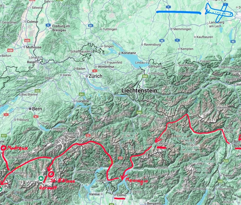 I'm headed to the village of Balzano, Italy, first just relax and wander the town for a couple of days. Then I'll travel to the infamous St Moritz, Switzerland to ski. I return to Italy and the Lake Como area for a week to explore this iconic lake north of Milan. Following that, I travel to the Zermatt area to ski and enjoy those spectacular mountains staying in the small village of St Niklaus, Switzerland.