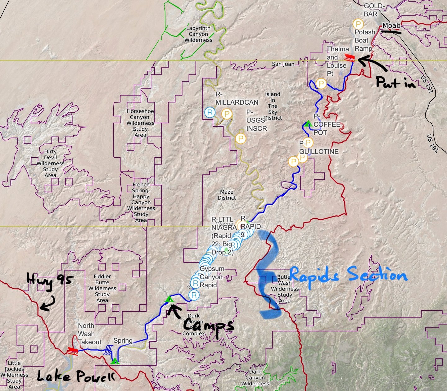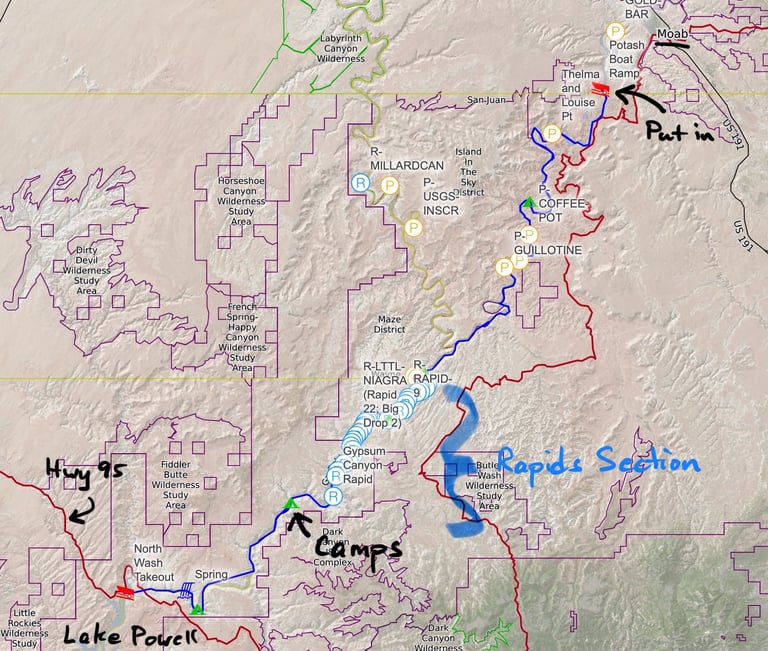 This roughly 98 mile float started at the Potash Boat Ramp near Moab, UT, ending at the North Wash Take Out above Lake Powell passing through Cataract Canyon. Seven of us comprised of 3 kayakers, 1 canoeist, and 2 rafts made the trip 9-12 October 2024.