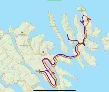 The first instinct was to climb into the car to head for a loop trail on the northeast side of the island. Three hundred meters from the house I couldn't feel the tether connection to my phone and had to turn back. I grabbed the phone with the striking realization that the hike I had in mind could almost be reached from where I was standing. The AirBnB owner shared that hiking anywhere in the Faroe Islands is acceptable providing one stays out of gardens. The fourth highest point on the island stood behind and above the house so why not hike up it and leave the car to pass the time parked?
