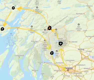 A couple of stops on the four drive to Glasgow broke up the drive. Swinging west five miles out the way allowed for a visit to the Glenfinnan Viaduct - made famous by the Harry Potter files. This time I arrived before the hoards of tourists to easily park. Though still feeling a little weak, I walked the quarter mile to the viaduct to see it and take pictures. Amazingly a train pulled by a current diesel locomotive arrived onto the viaduct and stopped to allow photos. A wave to the conductor brought a return wave - he seemed to really enjoy the attention. Many many people began arriving with word that another train would arrive in an hour or so. Glenfinnan is famous (circa 1756) as one of the places that Charles and George battled for the contested thrown of England. Returning to the drive, the route paralleled the same track and I passed a old steam locomotive heading toward the viaduct - that was what all the people were waiting to see. I stopped in Fort William for a coffee and pastry (of course!). I highly recommend the pastries at the small cafe and coffee shop called Rain; I think you'd almost have to venture to France to find pastries as delicious. (Perhaps some bias exists from feeling better after several days of illness.) The Fort Williams pedestrian mall has a concentration of several outdoor shops should one be in the need of outdoor activity supplies! The next segment of the journey brought me through Tyndrum a place I much enjoyed. I decided to rest with a hotel room in Glasgow after the long days travel and minor lingering flu symptoms.