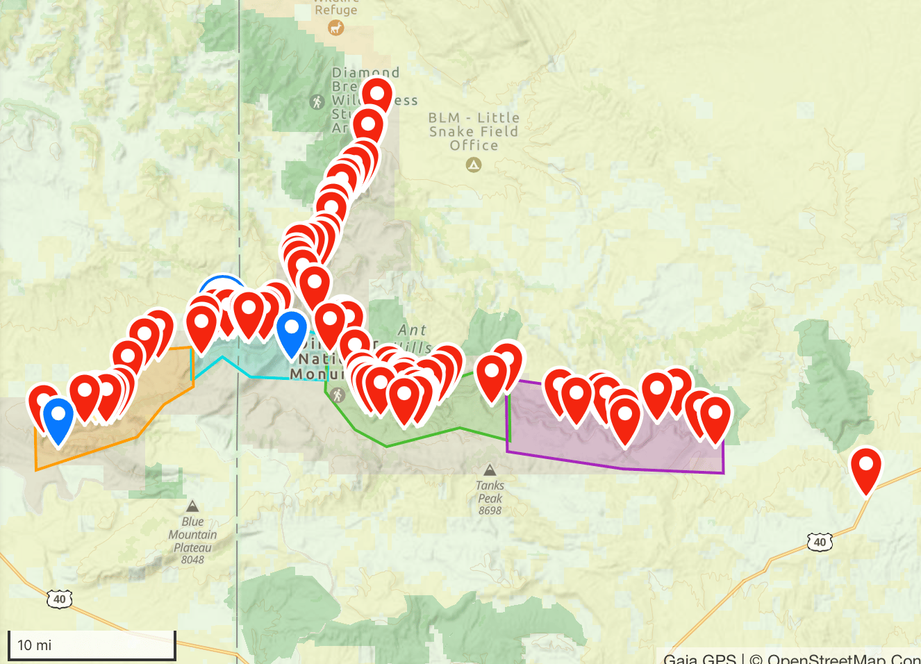 The map shows the general route starting on the Yampa river to the east traveling west to the confluence with the Green river and then taking out at the Dinosaur boat ramp. The waypoints north are on the Green river and not traveled on this float.Participants were Jim Ledbetter, Bill Rivers, Lance Masoner, Michael Buell, Eric Fink, Suzanne Opfer, Katie Larue, and Pete Betters.